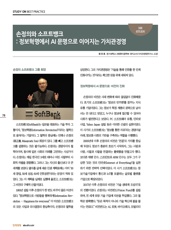 소프트뱅크(SoftBank)는 일본을 대표하는 기술 투자 그룹이자, '정보혁명(Information Revolution)'이라는 철학으로 움직이는 기업이다. 그리고 그 철학의 중심에는 언제나 손정의(孫正義, Masayoshi Son) 회장이 있다. 그를 빼고 소프트뱅크를 설명하는 것은 불가능하다. 손정의는 경영자이자 철학자이며, 동시에 일본 사회...