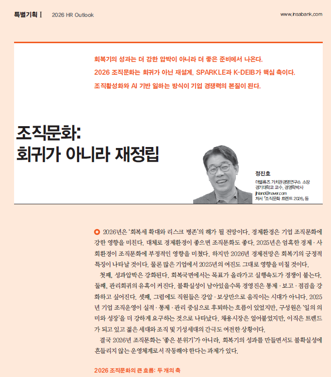 경제환경은 기업 조직문화에 강한 영향을 미친다. 대체로 경제환경이 좋으면 조직문화도 좋다. 2025년은 엄혹한 사회/경제환경이 조직문화에 부정적인 영향을 미쳤다. 하지만, 2026년 경제전망은 회복기의 긍정적 특징이 나타날 것이다. 물론 많은 기업에서 2025년의 여진도 그대로 영향을 미칠 것이다. 첫째, 성과압박은 강...