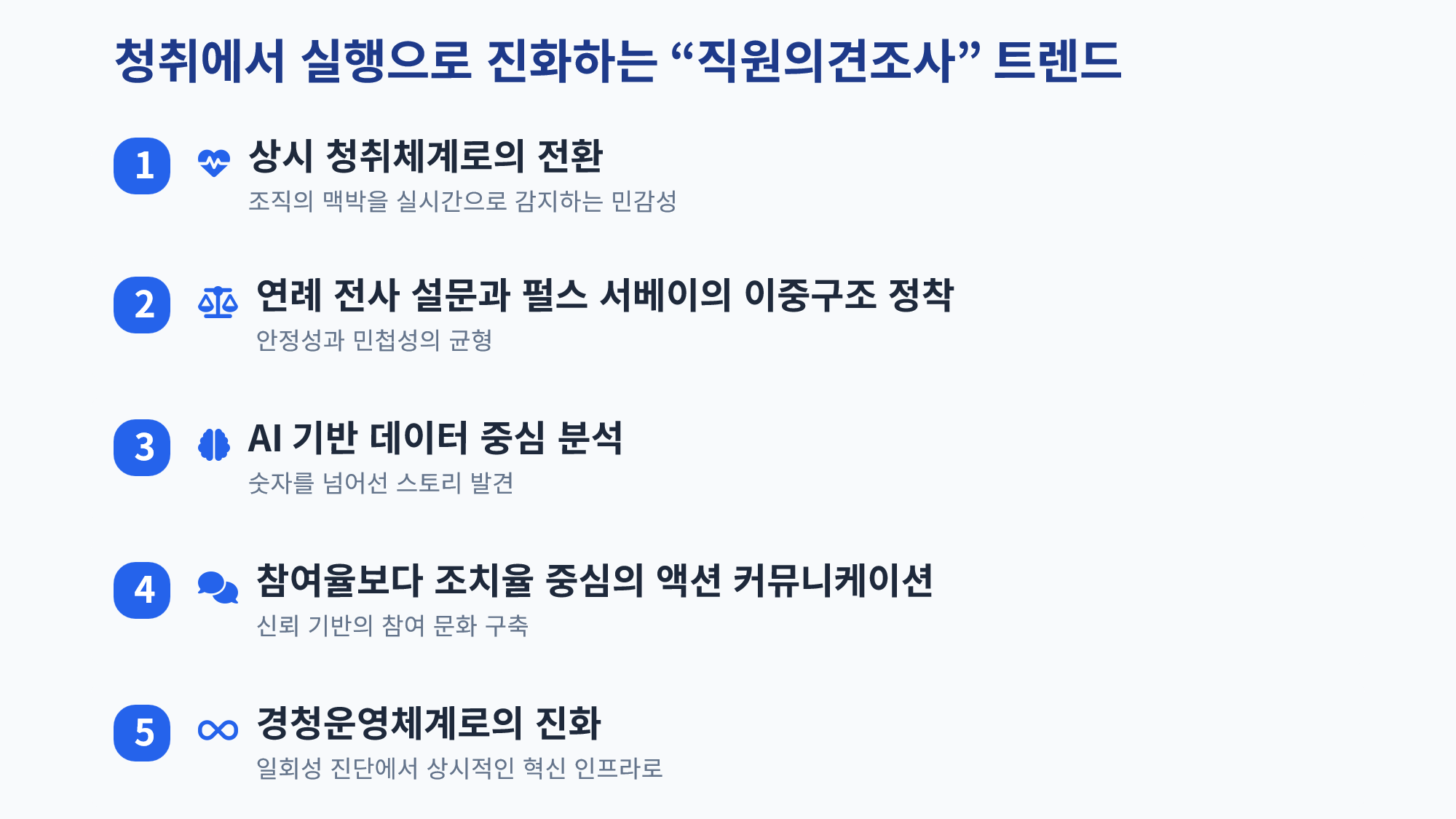 "직원 만족도 조사는 1년에 한 번 하는 연례행사다." 불과 몇 년 전까지만 해도 기업 현장에서 흔히 들리던 말이다. 그러나 급변하는 경영환경과 인재 경쟁, 그리고 AI 기반 분석기술의 확산은 직원의견조사(Employee Survey)의 성격을 근본적으로 바꾸어 놓았다. 2025년 현재, 직원의견조사는 단순히 조직 현황을 파악하는 ...