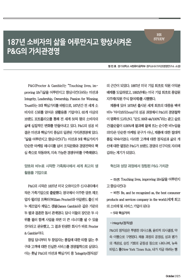 들어가며 P&G(Procter & Gamble)는 "Touching lives, improving life"(삶을 어루만지고 향상시킨다)라는 미션과 Integrity, Leadership, Ownership, Passion for Winning, Trust라는 5대 핵심가치를 바탕으로, 187년간 전 세계 소비자의 신뢰를 얻어온 생활용품 기업이다. 타이드(Tide), 질레트(Gillette), 팸퍼스(P...